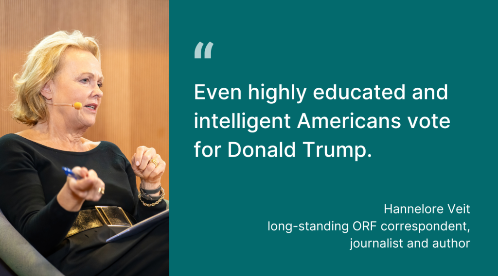 Hannelore Veit, who covered Donald Trump’s first term as head of the ORF’s Washington office, got to the bottom of the Trump phenomenon. During the primaries, she travelled across the USA, capturing the mood: from the academic elite to the workers and farmers in rural communities, aptly summarised in her current book “Who’s Afraid of Donald Trump?”. She presented copies of this book to the participants of the event, with a personal dedication.